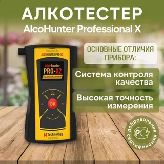 - AlcoHunter Professional X2 &mdash доступный по цене профессиональный алкотестер, по точности не уступающий дорогим анализаторам алкоголя для ГИБДД и медслужб!
