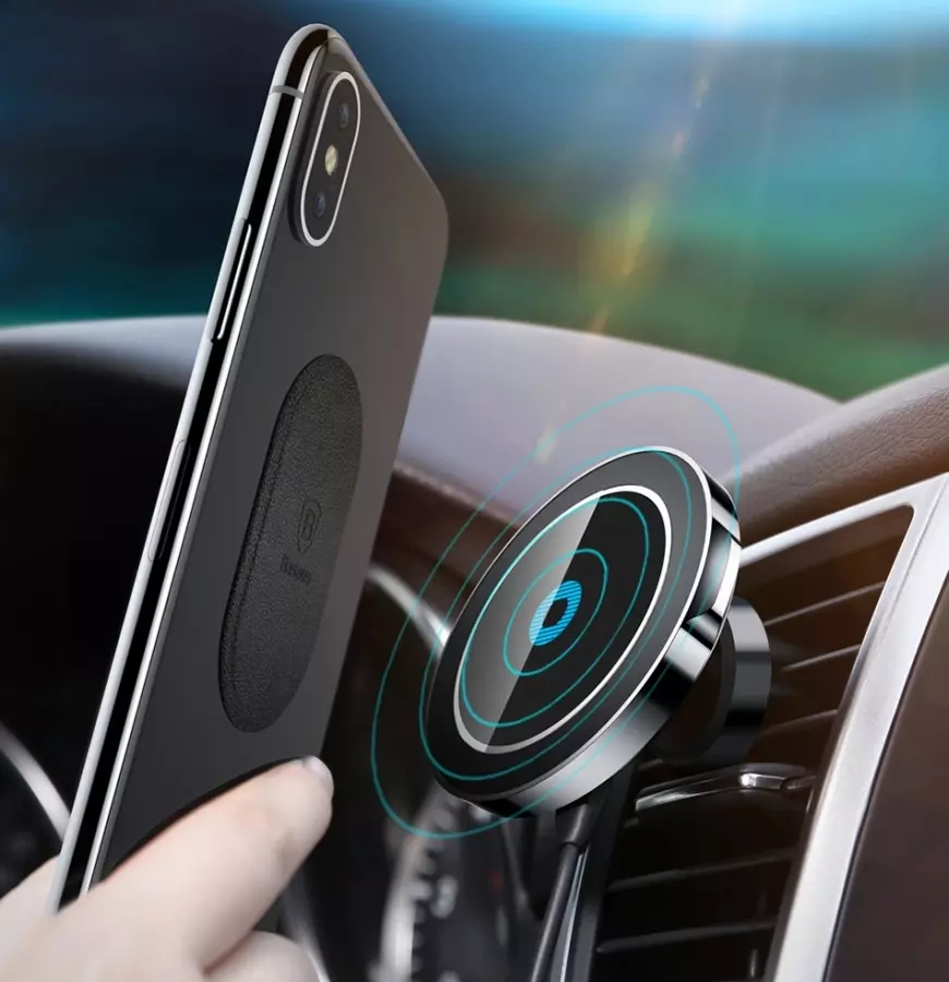 - Зарядное устройство крепится или на вентиляционную решетку (при помощи силиконовых креплений держателя), или на плоскую поверхность (благодаря липкой ленте на устанавливаемой ножке держателя). Смартфон крепится к зарядной панели при помощи магнита и металлической пластины, которая устанавливается на смартфон, или над/под чехол чтобы смартфон мог безпрепятственно заряжаться в чехле, толщина чехла не должна быть более 3 мм