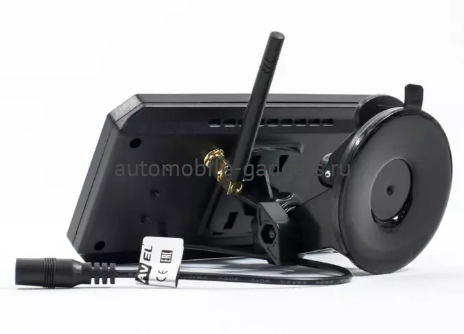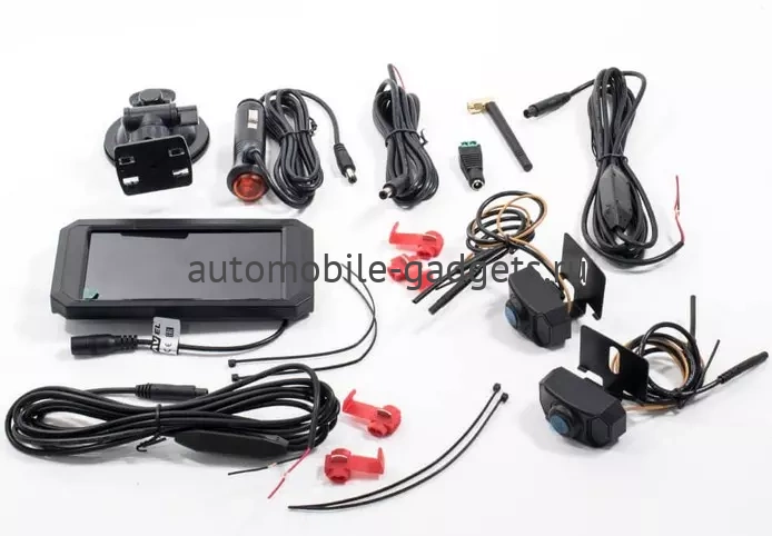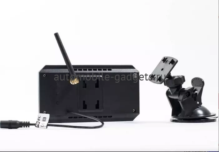 Поставляющийся с двумя  камерами для автомобиля монитор выполнен в черном пластиковом корпусе и имеет 5-дюймовый экран, на который выводится текущее изображение с AHD камер по беспроводному соединению. При этом отображение может происходить как поочередно, так и совместно - в этом случае экран будет поделен пополам и на каждой половине будет видна картинка с соответствующей камеры.  Комплект из камер  заднего вида с монитором включает в себя провода питания для  устройств, крепление и адаптер питания монитора от прикуривателя. Для передачи изображения с камер  на монитор провод не понадобится.