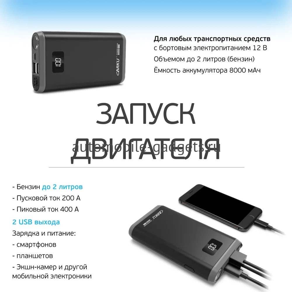 - Carku Powerbank 8000 Plus &mdash внешний аккумулятор для подзарядки гаджетов и пусковое устройство для запуска двигателей транспортных средств