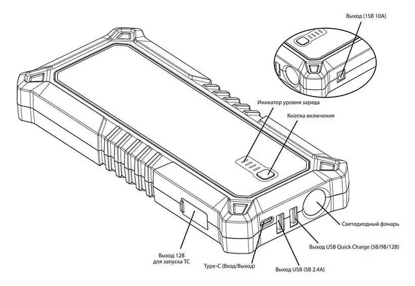 | Выходы | выход для подключения пусковых проводов 12В, Type-C 15W (5В/3А), USB-выход QuickCharge (5В/2.4А, 9В/2А, 12В/1А), USВ-выход 5В/2.4А, выход для автоприборов (прикуриватель-мама) 15В/10A |