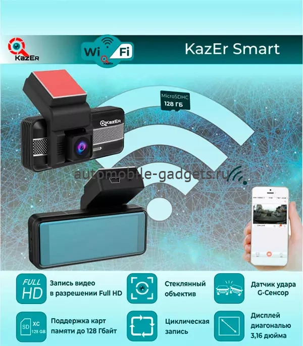 KazEr Smart WiFi - стильный компактный видеорегистратор с управлением через смартфон. Теперь просмотреть отснятый регистратором видео и фотоматериал можно просматривать в приложение на вашем мобильном устройстве. Удобный интерфейс мобильного приложения поможет быстро синхронизироваться с видеорегистратором и удаленно управлять его настройками. Приложение доступно для скачивания на системах IOS и Android.
