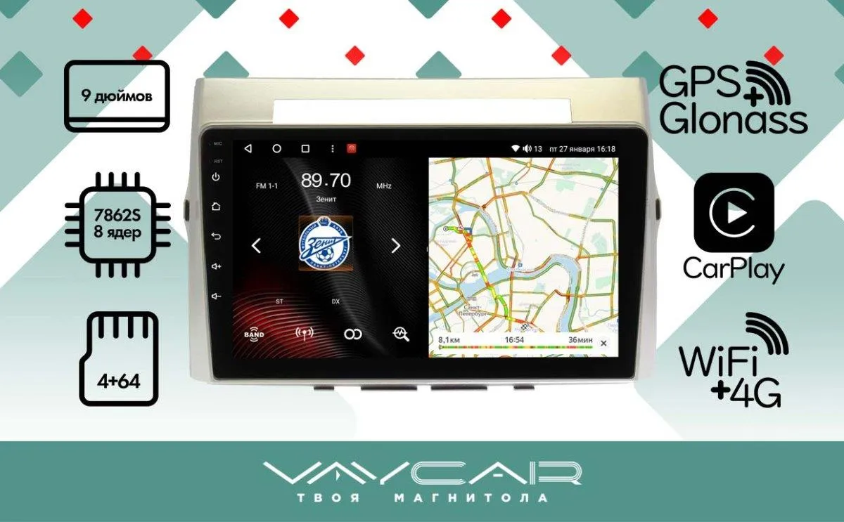—Магнитола Vaycar 09VO4 для TOYOTA Corolla Verso 2004-2009 (Андроид, 4+64Гб)