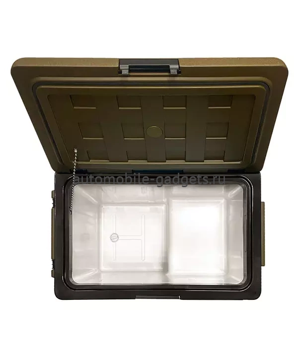 Крышка автохолодильника закрывается на автоматическую защёлку, что исключает случайное открытие и потерю холода изнутри. Крышка автохолодильника имеет 4 подстаканника, на которых можно надёжно расположить емкости с напитками. Специальные углубления позволяют расположить телефон или планшет, в удобное для просмотра видео, положение. Любителей рыбалки, несомненно, порадует наличие на крышке линейки для измерения улова или других трофеев. Благодаря перечисленным особенностям, холодильник идеально подходит для отдыха на природе.