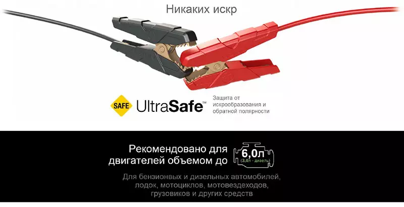 - Ультрабезопасное устройство с защитой от неумелого обращения искрообразования и обратной полярности обеспечивает возможность безопасного подключения к любому аккумулятору