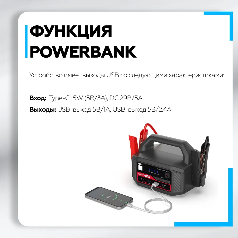 – наличие порта USB Type-C 15W, функционирующего в режиме вход (является входом для зарядки самого пускового устройства)