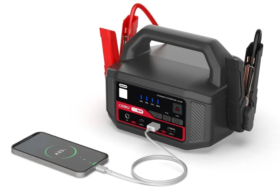 Carku Pro Max — пусковое устройство 12/24В. Многофункциональный внешний источник питания, который поможет завести мотор вашей машины зимой при посаженном аккумуляторе и так же способен обеспечить зарядку электроники. Улучшенные пусковые характеристики, для еще большей уверенности при нештатных ситуациях.
