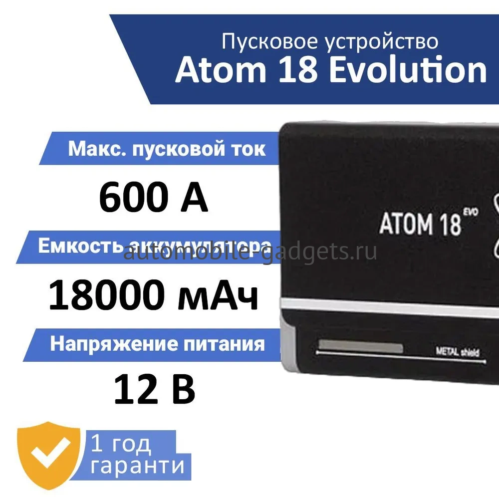 - ATOM 18 EVOLUTION предназначен для запуска двигателей мотоциклов, легковых машин, генераторов и прочих устройств для питания которых используется 12В аккумуляторы.