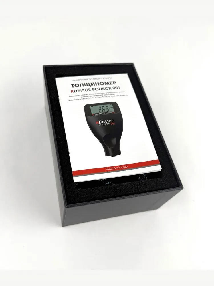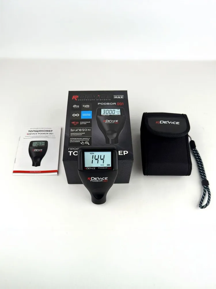 Комплект поставки RDEVICE MAX: - Толщиномер rDevice PODBOR 001 Тестовый комплект: - Металлическая основа: 1 шт. - Алюминиевая основа: 1 шт. - Комплект эталонных пленок : 5 шт. (толщины пленок могут меняться в зависимости от поставки) Комплект чехлов: - Фирменная сумка-чехол для хранения и переноски - Фирменный резиновый противоударный чехол rDevice - Фирменный ремешок на руку Руководство по эксплуатации на русском языке c гарантийным талоном (заполненный) Дополнительно включено: - Батарейки ААА GP Аlkaline 2 шт. - Таблица толщин на 500 авто - Магнитная дефектовочная линейка - Дополнительная шайба с магнитной шпатлевкой (образец для тестирования функции).
