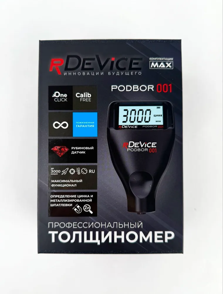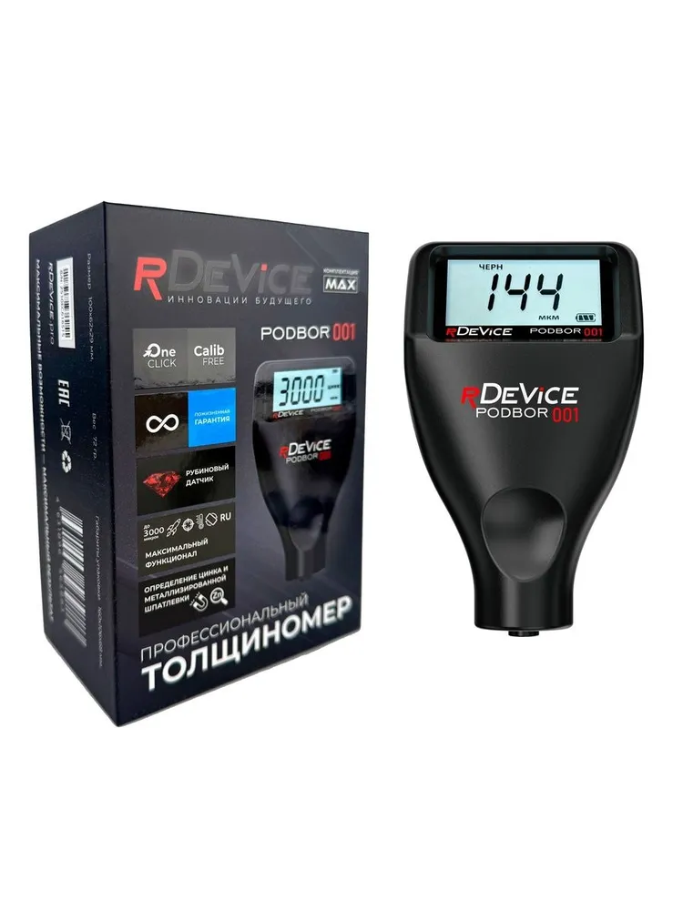 РДЕВАЙС ПОДБОР 001 для оценки состояния ЛКП авто - имеет все современные функции: измерение покрытий на всех типах металлов (железо, алюминий, оцинковка, медь и др.), определение ЦИНКА, специальной МЕТАЛЛИЗИРОВАННОЙ ШПАТЛЕВКИ, диапазон измерений до 3000 микрон. Плюс, новейшие функции, доступные только "УМНЫМ" толщиномерам RDEVICE:
