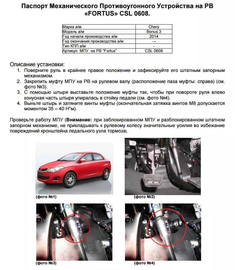 —Замок рулевого вала FORTUS CSL 0608 для CHERY Bonus 3 2014 -