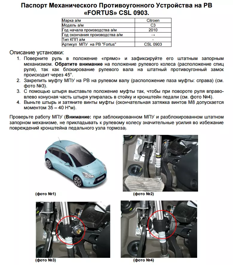 —ЗАМОК РУЛЕВОГО ВАЛА FORTUS CSL 0903 ДЛЯ CITROEN C3 2010-