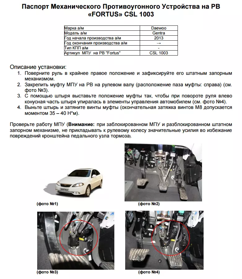 —Замок рулевого вала FORTUS CSL 1003 для DAEWOO Gentra 2013-