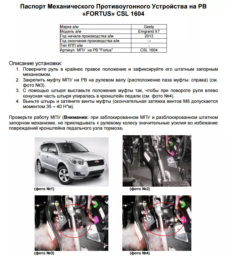 ЗАМОК РУЛЕВОГО ВАЛА FORTUS CSL 1604 ДЛЯ GEELY EMGRAND X7 2013-