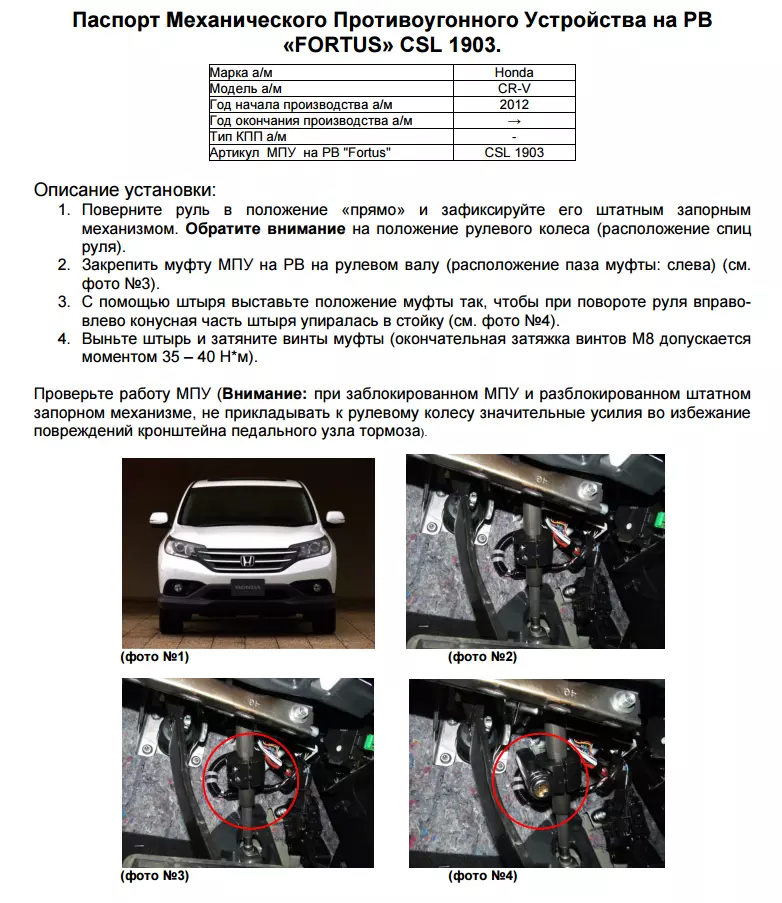 —Замок рулевого вала FORTUS CSL 1903 для HONDA CR-V 2012-2015