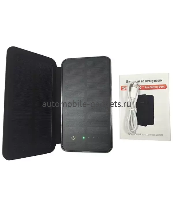 Зарядное устройство "SITITEK Sun-Battery Duos" состоящее из двух солнечных панелей и аккумулятора большой (10000 мА/ч) емкости. Выполнено в раскладном металлическом корпусе может использоваться для зарядки различной мелкой портативной техники: мобильных телефонов цифровых фотокамер MP3-плееров и др. Сам прибор может заряжаться от солнечной энергии или через USB-кабель от ПК. Для того чтобы зарядить свой гаджет при отсутствии розетки просто подключите его к системе автономного питания используя USB-кабель который идет в комплекте.